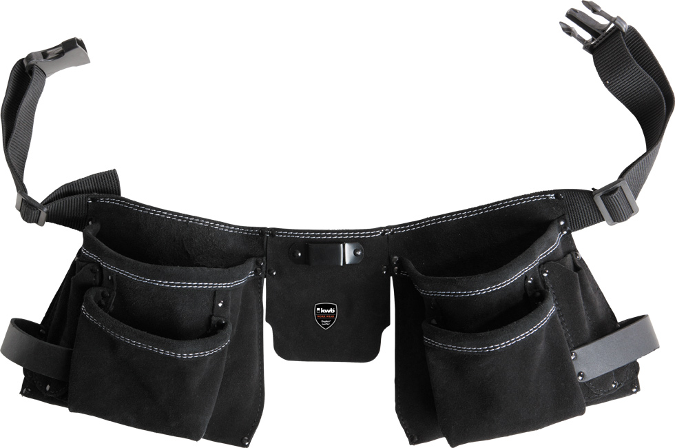 Поясная сумка для инструмента Einhell - двойная, из воловьей кожи (спилок), чёрного цвета; двойной шов, контрастная строчка серебристой нитью; концы строчек дополнительно закреплены заклёпками, что защищает их от разрыва; пояс из нейлона (длина 75-135 х 5 см), с двух сторон по одной большой сумке для гвоздей, по одному большому отделению, по три узких отделения; один чехол для ножа, два держателя для молотков, металлический зажим для измерительной рулетки; с эмблемой WORK WEAR компании kwb.